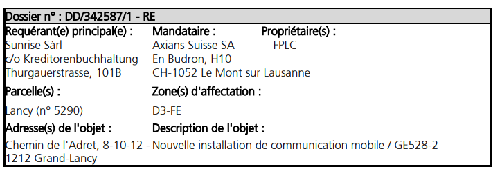 Objet  :  Nouvelle station de base de téléphonie mobile pour Sunrise Communications SA / GE374-1