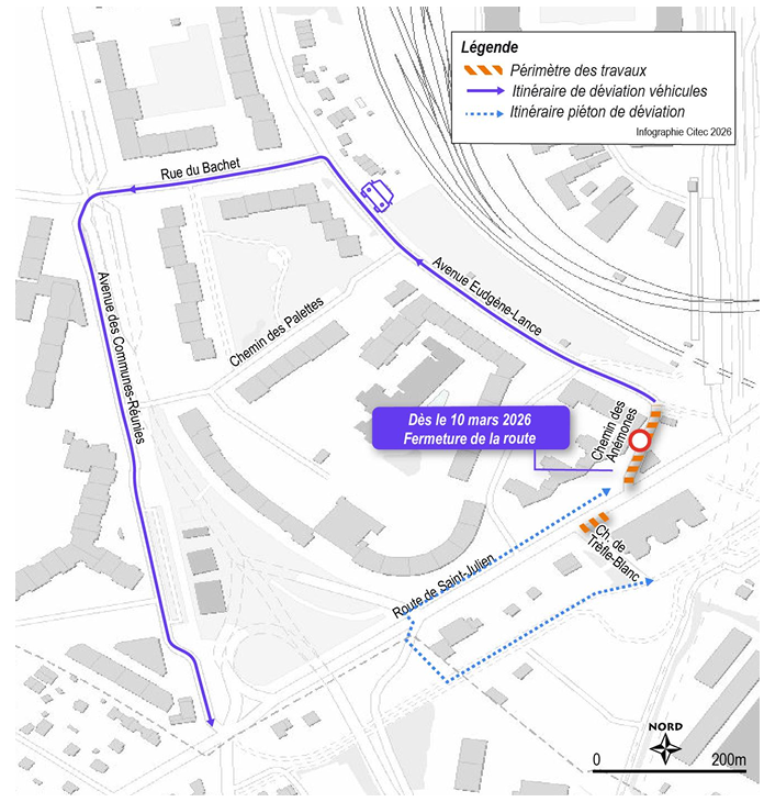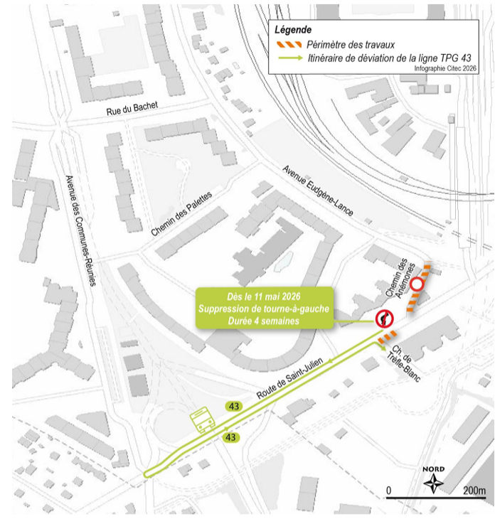 Concernant la ligne TPG 43, le tourne-à-gauche direct depuis la route de Saint-Julien vers le chemin de Trefle-Blanc n’est plus possible pendant 4 semaines à partir du 11 mai 2026. Les bus poursuivent leur itinéraire sur la route de Saint-Julien jusqu’au giratoire des Communes-Réunies, où ils effectuent un demi-tour. Ils reviennent ensuite en sens inverse afin de rejoindre le chemin de Trefle-Blanc et reprendre leur parcours habituel.