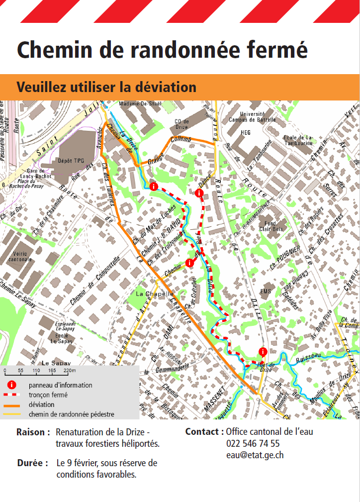 Afin d’assurer la sécurité, le chemin pédestre longeant la Drize sera temporairement fermé depuis le chemin de Grange-Collomb jusqu’à la route de Drize et la traversée sur le pont du chemin du Bief-à-Dance ne sera pas possible ce jour-là. Une déviation sera mise en place.