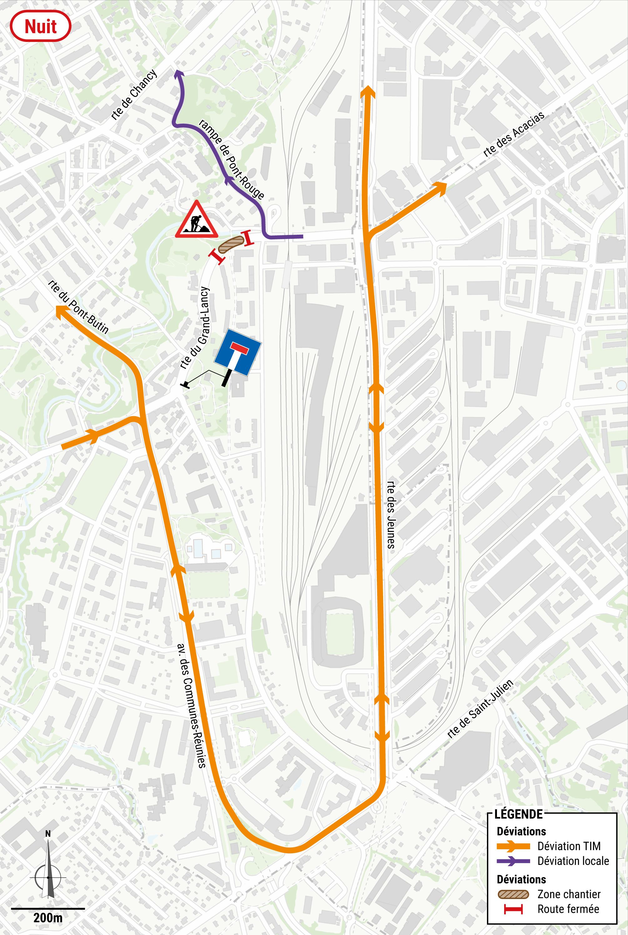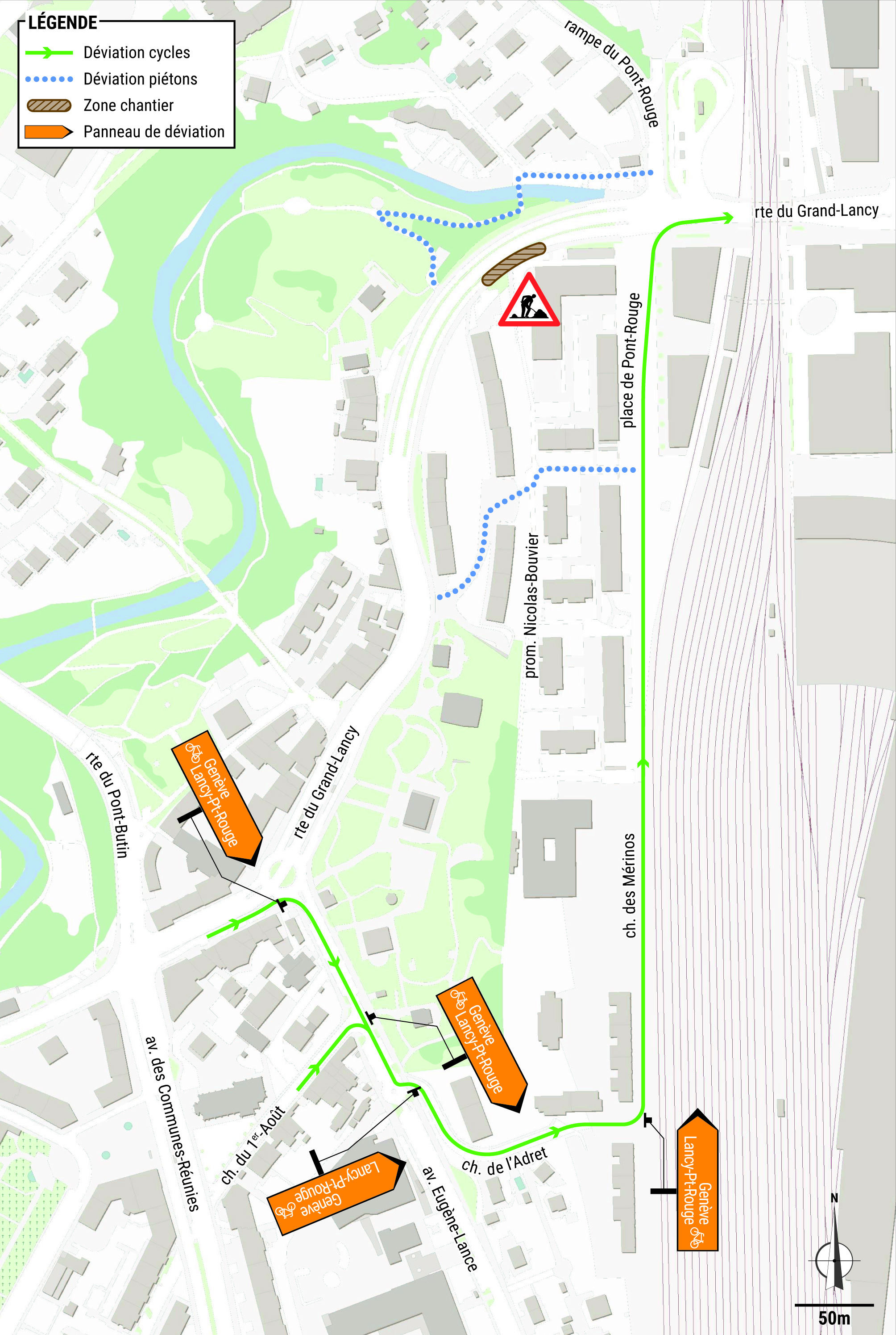 Le passage sous-voies vient s’implanter au travers de la route du Grand-Lancy de sorte à permettre la liaison la plus directe possible entre quartiers. Il a été dessiné par le bureau d’architecte Meier & associés, et son financement est entièrement pris en charge par le Canton de Genève, puisqu’il permet l’harmonisation des trajets intercommunaux. Ce passage souterrain constitue une des dernières étapes dans le développement du quartier de Pont-Rouge qui regroupe plus de 1’800 habitant-es.