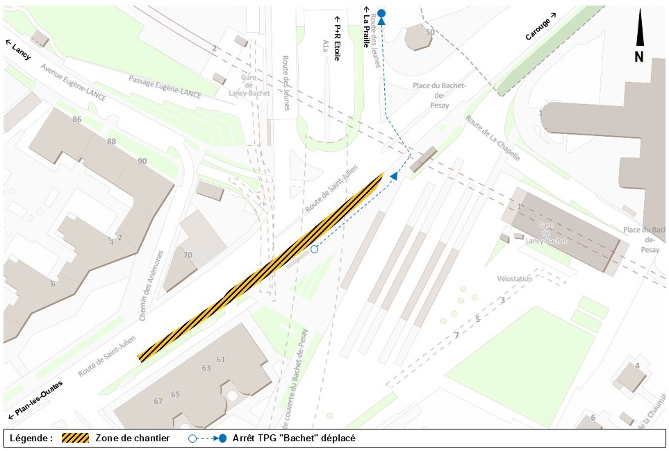 - Lignes et arrêts de transports publics maintenus, excepté l'arrêt TPG "Bachet" en direction de la Praille qui est déplacé sur la route des Jeunes.